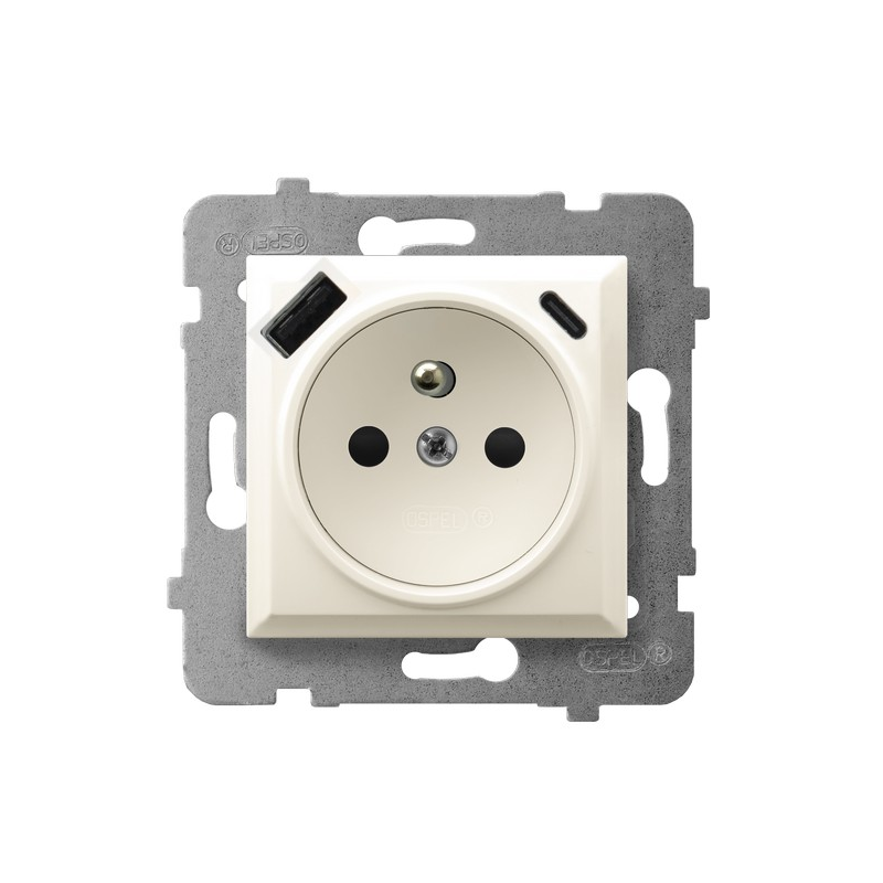 Gniazdo pojedyncze z uziemieniem z przesłonami torów prądowych, z ładowarką USB A+C Ecru Ospel Aria