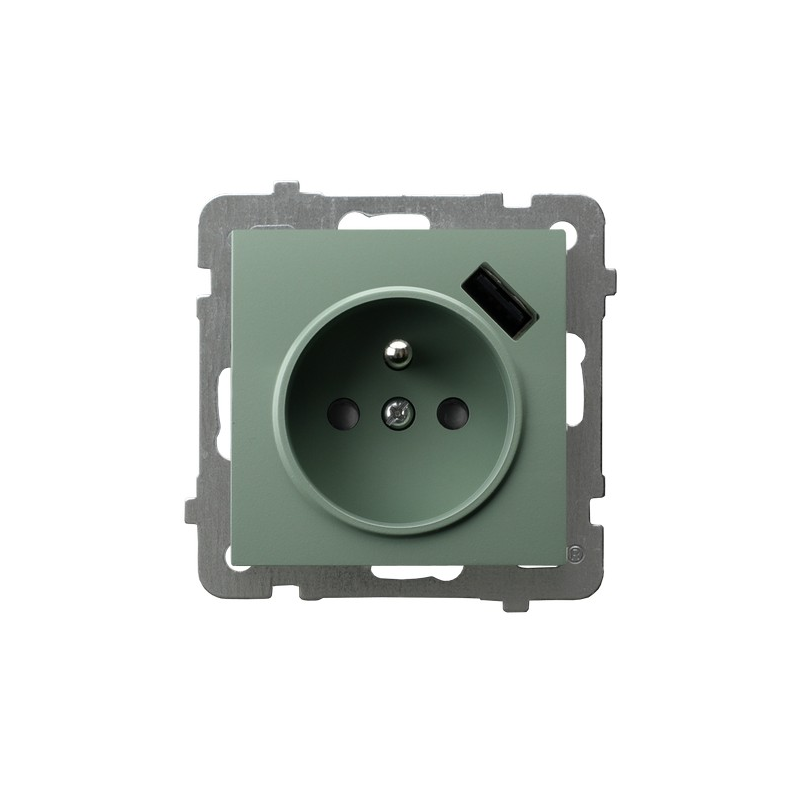 Gniazdo pojedyncze z uziemieniem z przesłonami torów prądowych, z ładowarką USB Zielony mat Ospel As