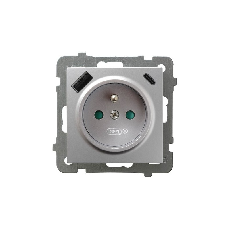 Gniazdo pojedyncze z uziemieniem z przesłonami torów prądowych, z ładowarką USB A+C Srebro Ospel As