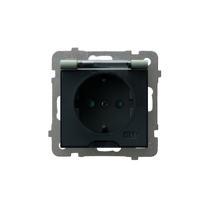 Gniazdo bryzgoszczelne z uziemieniem schuko IP-44 z przesłonami torów prądowych wieczko przezroczyste Zielony mat Ospel As