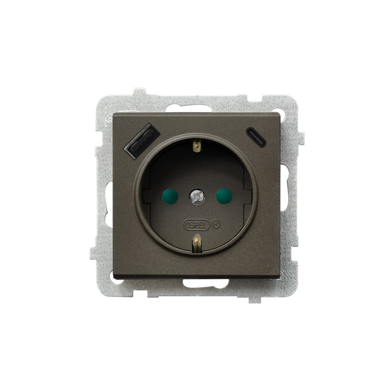Gniazdo pojedyncze z uziemieniem schuko z przesłonami torów prądowych, z ładowarką USB A+C Czekoladowy metalik Ospel Sonata