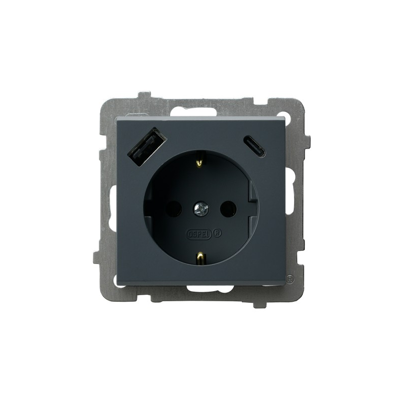 Gniazdo pojedyncze z uziemieniem schuko z przesłonami torów prądowych, z ładowarką USB A+C Szary grafit Ospel Sonata