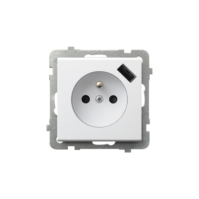 Gniazdo pojedyncze z uziemieniem z przesłonami torów prądowych, z ładowarką USB Biały mat Ospel Sonata