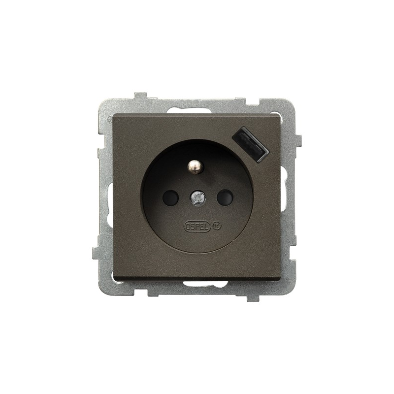 Gniazdo pojedyncze z uziemieniem z przesłonami torów prądowych, z ładowarką USB A+C Czekoladowy metalik Ospel Sonata