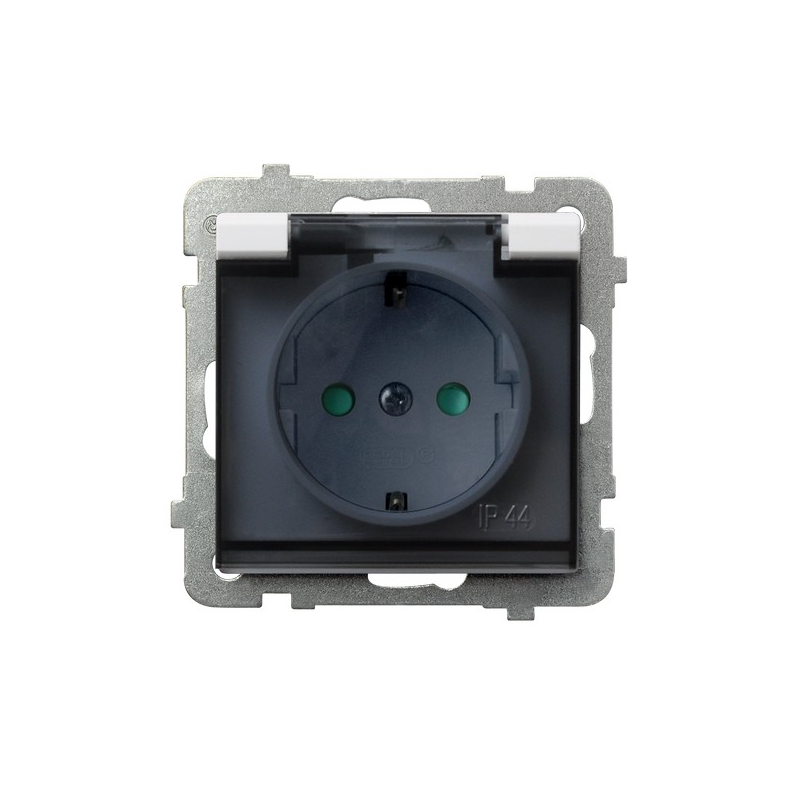 Gniazdo bryzgoszczelne z uziemieniem schuko IP-44 z przesłonami torów prądowych wieczko przezroczyste Biały mat Ospel Sonata
