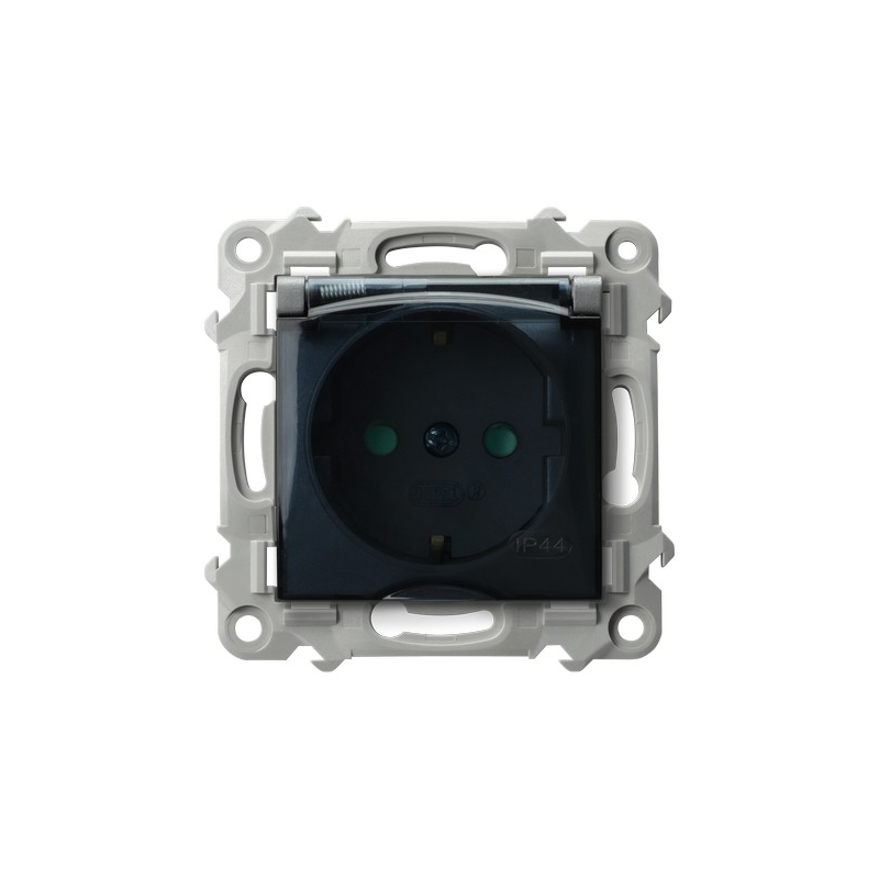 Gniazdo bryzgoszczelne z uziemieniem schuko IP-44 wieczko przezroczyste z przesłonami torów prądowych Szary mat Ospel Szafir
