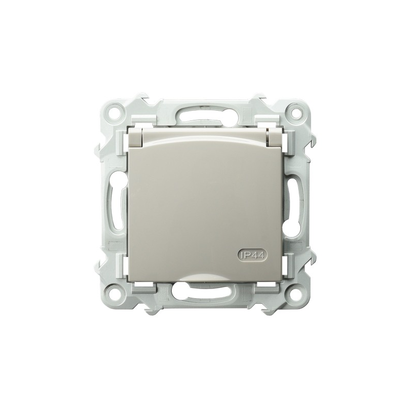 Gniazdo bryzgoszczelne z uziemieniem schuko IP-44 wieczko w kolorze wyrobu, z przesłonami torów prądowych Kaszmirowy beż Ospel Szafir